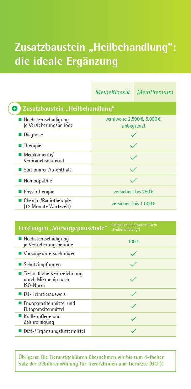 Sie wünschen auch abseits von Operationen im Krankheitsfall beste Absicherung für Ihren vierbeinigen Freund? Der Zusatzbaustein Heilbehandlung bietet genau das und übernimmt im Rahmen einer Pauschale sogar diverse Vorsorgeleistungen. Der Zusatzbaustein ergänzt auf Wunsch beide Tarife.